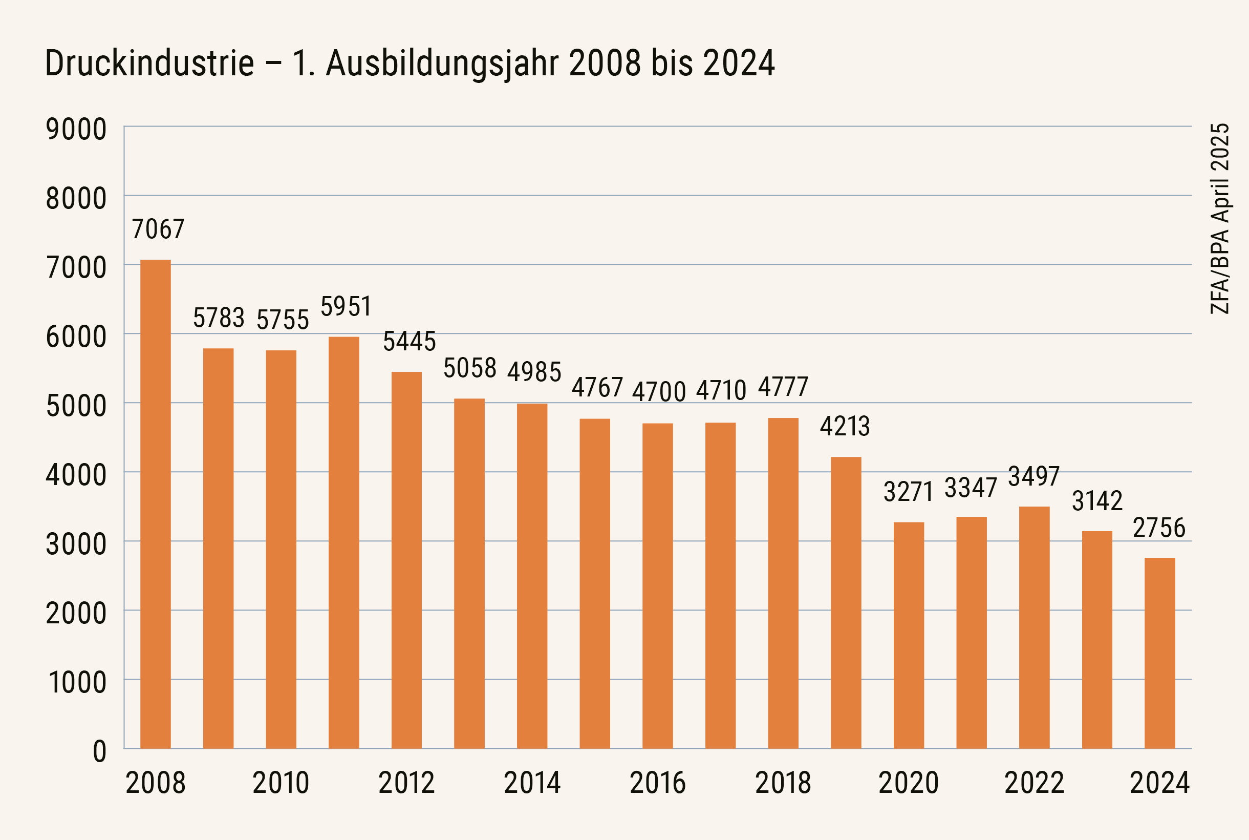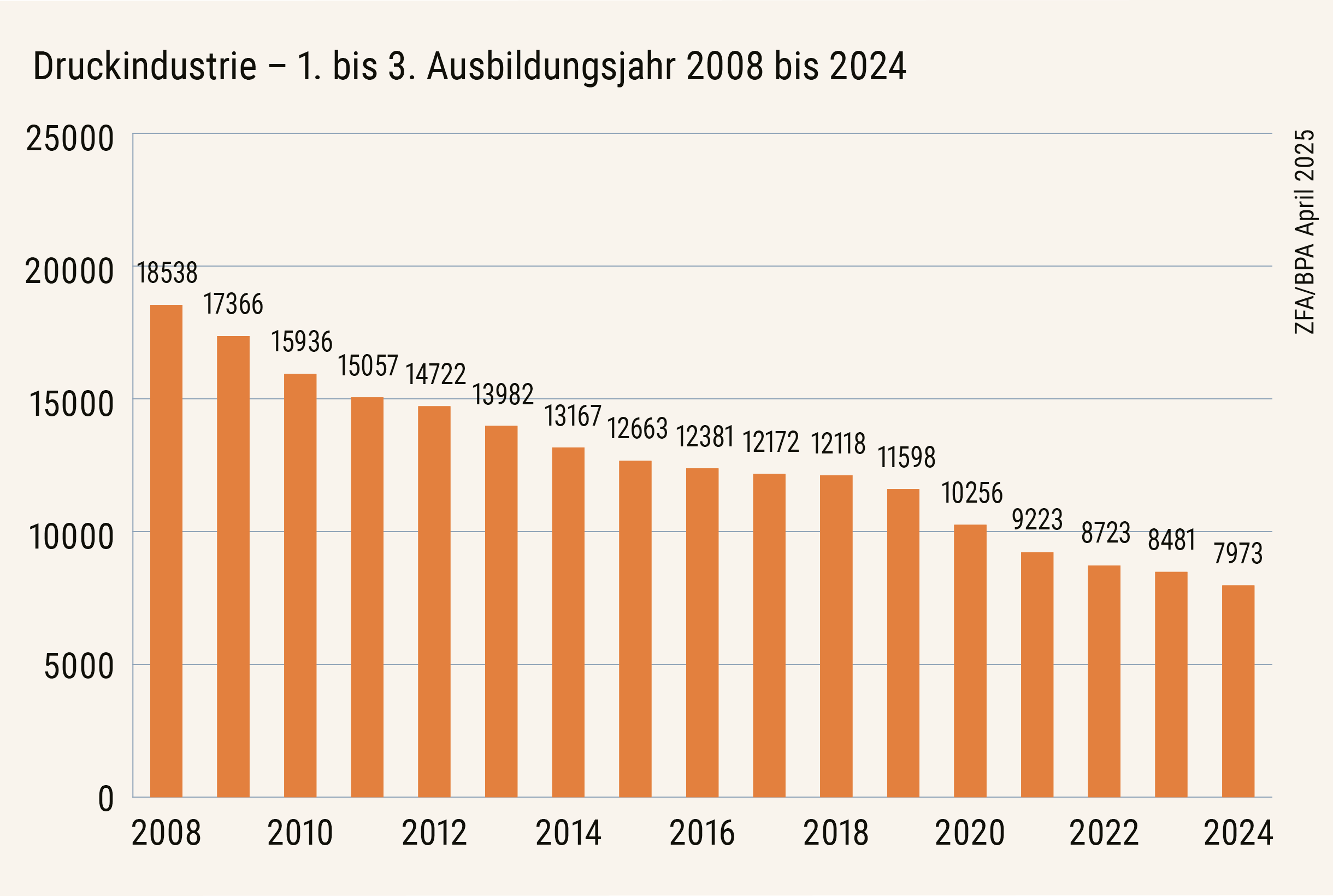Für das Ausbildungsjahr 2024/2025 weist die Statistik nur noch 2.756 Neuverträge über alle Berufe der Branche hinweg aus – ein Rückgang von 12,3 Prozent gegenüber dem Vorjahr. Auch die Gesamtzahl aller Ausbildungsverhältnisse ist weiter gesunken: Mit 7.973 gemeldeten Verträgen wurde erstmals bei den Druck- und Medienberufen die Marke von 8.000 unterschritten – ein Minus von 6 Prozent im Vergleich zu 2023. Im Jahr 2010 war diese Zahl noch doppelt so hoch – mit 15.936 Auszubildenden.